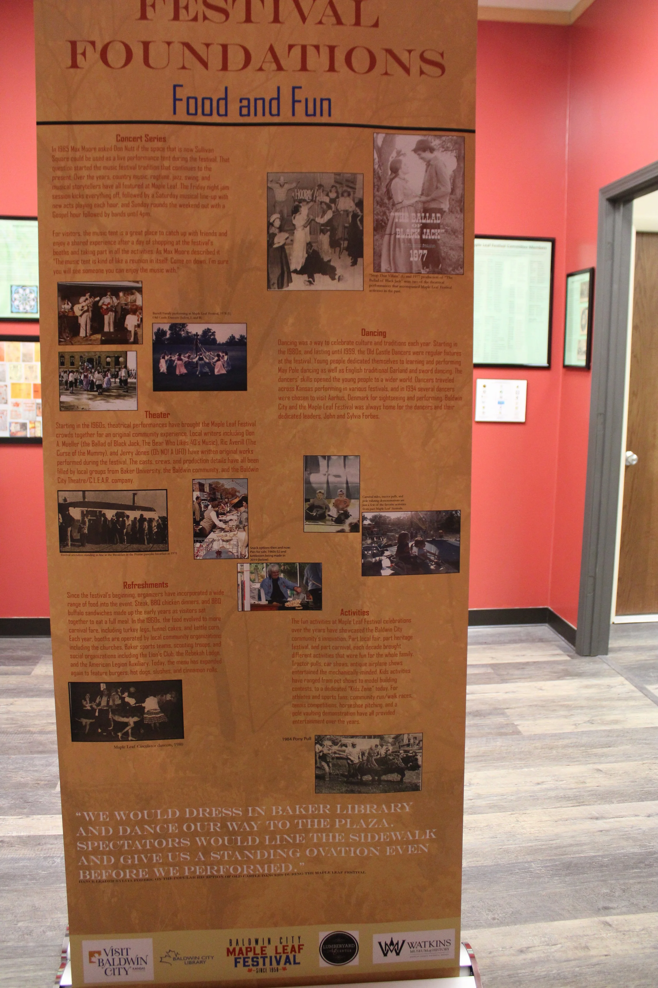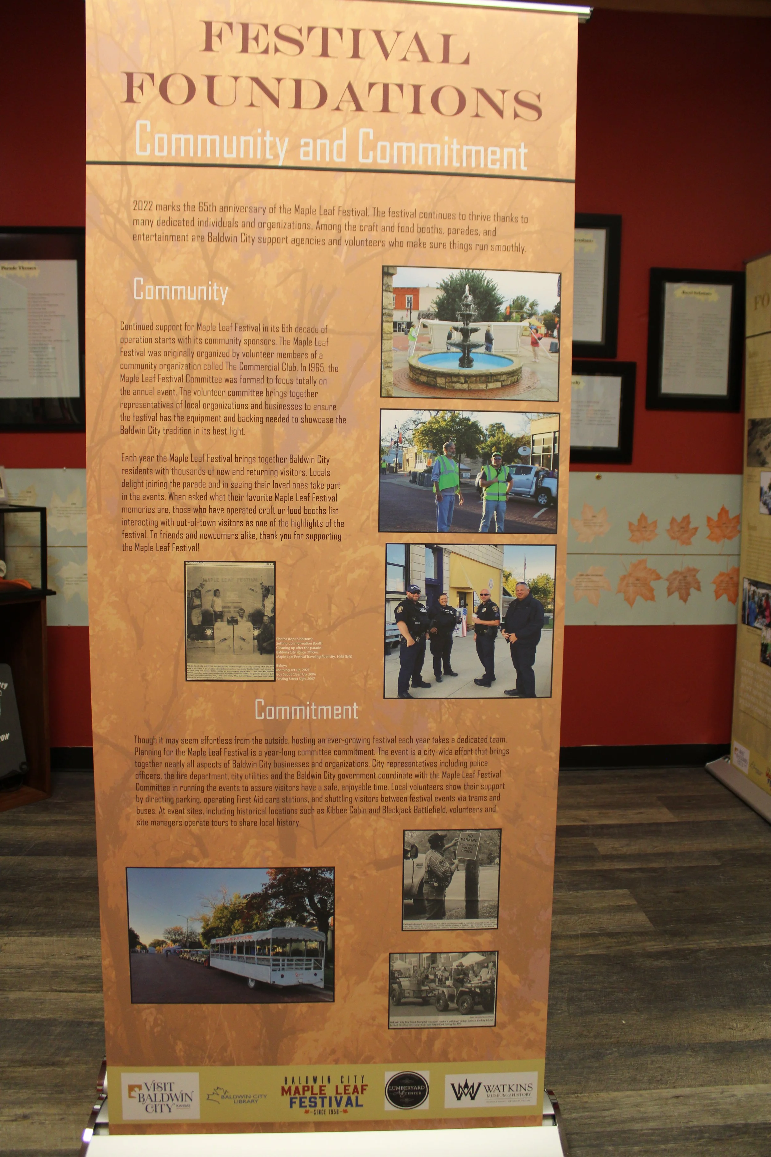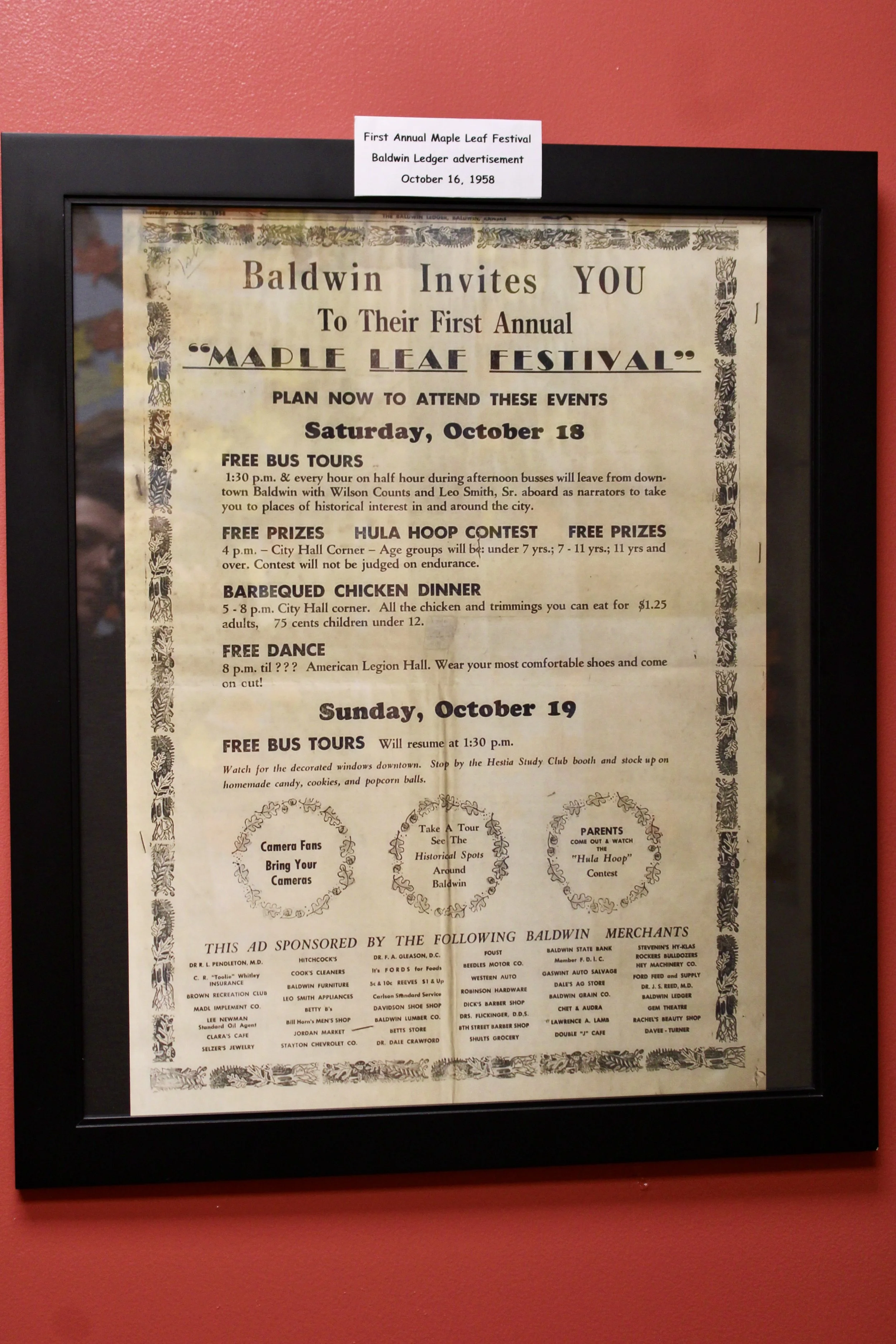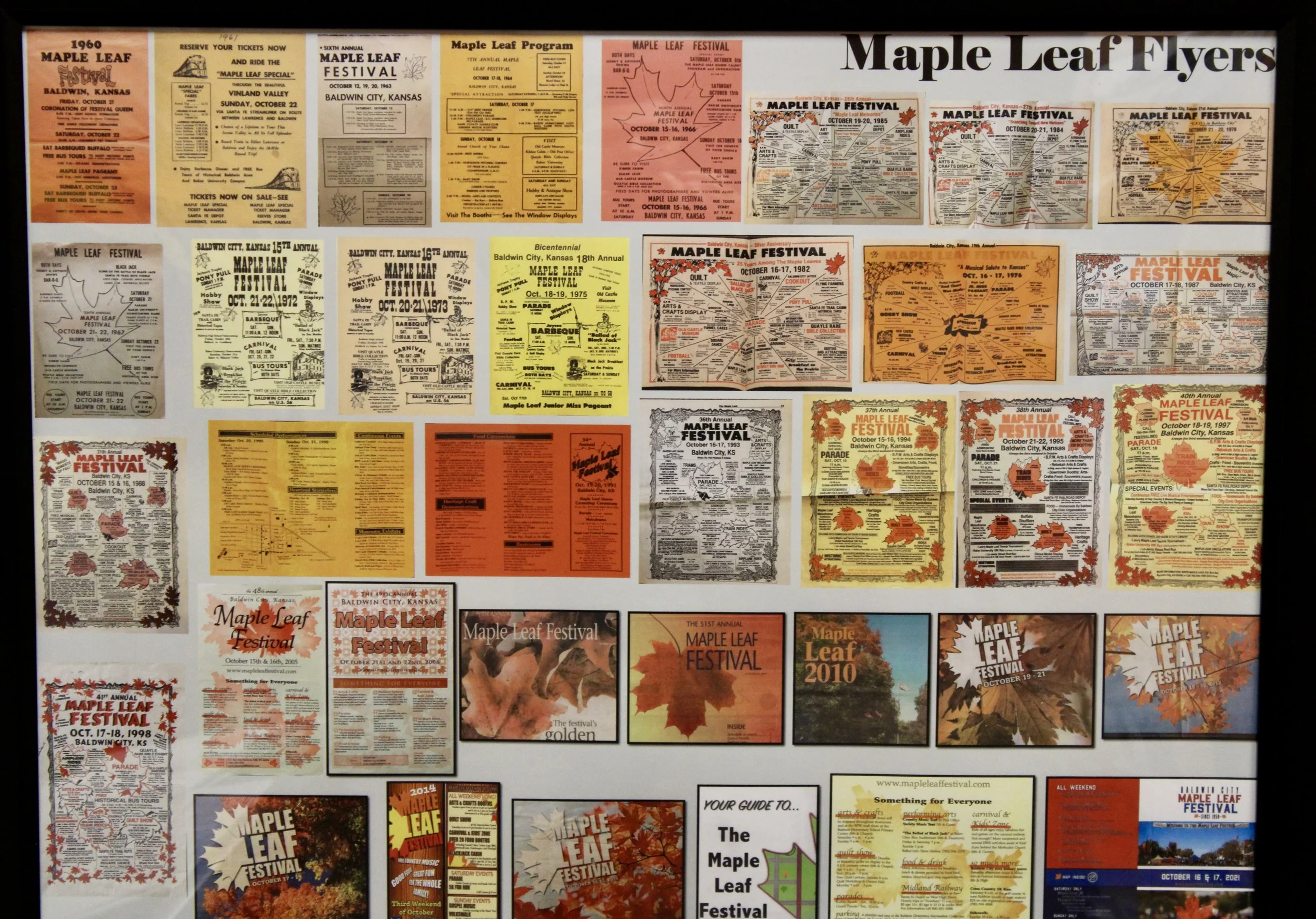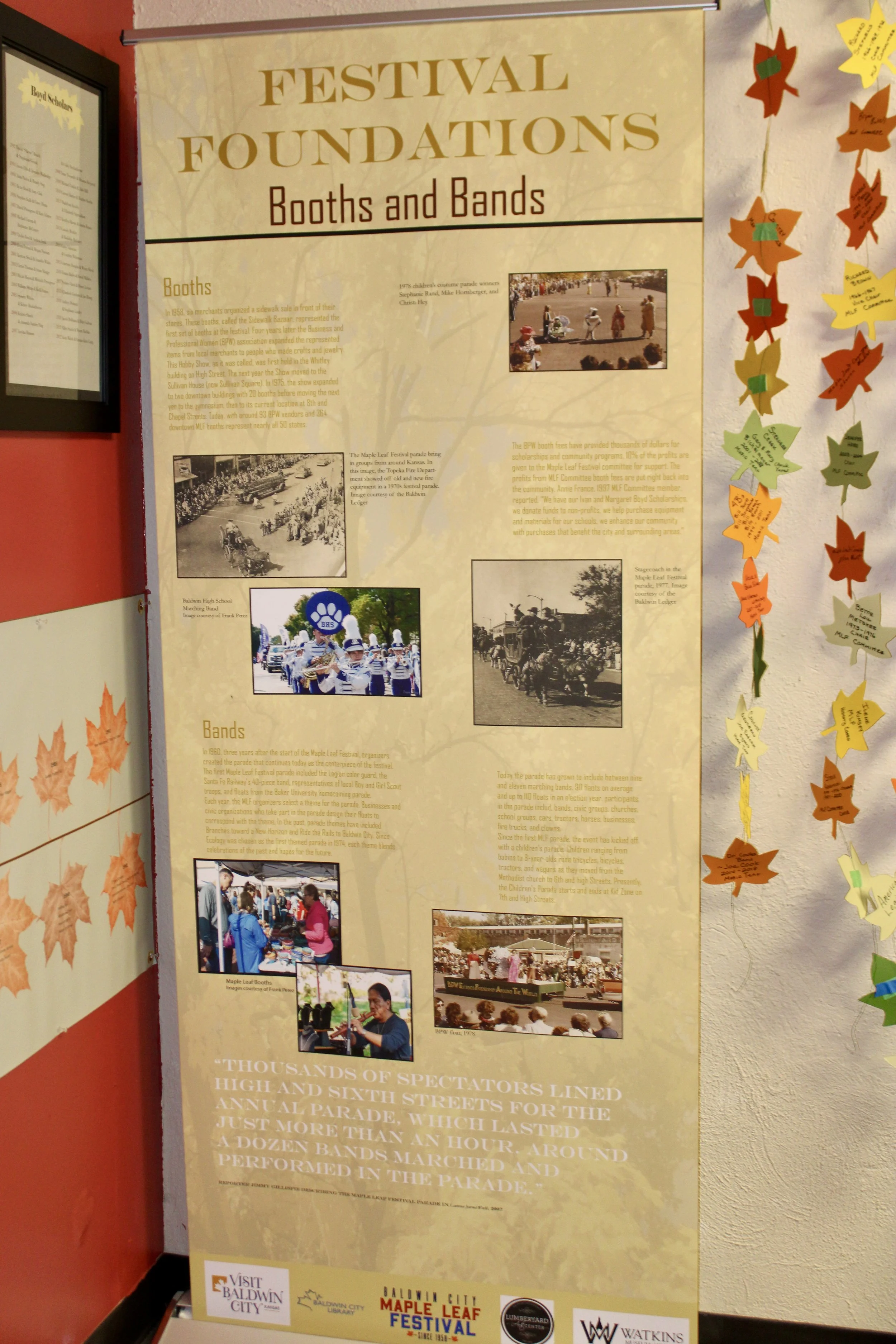 The Maple Leaf Festival Committee developed a four-year History Project showcasing highlighted festival themes. From 2019 through 2022 a professional history exhibit was displayed each year in the Lumberyard Arts Center gallery. The accumulated history, including the following themes, is now on permanent display for public viewing in the Baldwin City Chamber of Commerce, 719 High St.